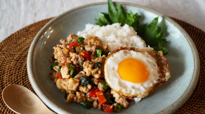 - ①と②とごま油を和えて、ご飯の上に盛る。中心に卵黄を落として、ネギと白ゴマを散らす。