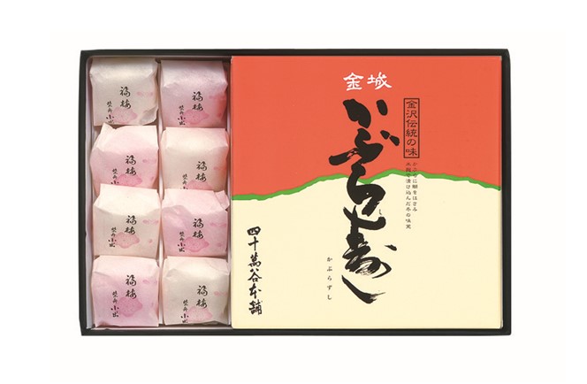 かぶら寿し(約3枚/440g)と金沢の老舗和菓子店「柴舟小出」の福梅(8個入)のセットです。